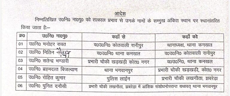 हरिद्वार। एसएसपी हरिद्वार ने देर रात cको लाइन हाजिर कर दिया। उनकी जगह रानीपुर कोतवाली के वरिष्ठ उप निरीक्षक मनोहर रावत को कनखल थानाध्यक्ष बनाया गया है। जबकि वरिष्ठ उप निरीक्षक नितिन चौहान को रानीपुर कोतवाली का वरिष्ठ उपनिरीक्षक बनाकर भेजा गया है। खड़खड़ी चौकी प्रभारी सतेंद्र भंडारी को कनखल का एसएसआई बनाया गया है।