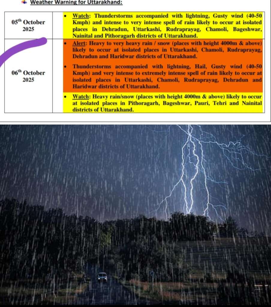 मौसम विभाग ने 7 और 8 अक्टूबर को उत्तराखंड के देहरादून, उत्तरकाशी, रुद्रप्रयाग, चमोली, बागेश्वर, नैनीताल और पिथौरागढ़ जिलों में अलग-अलग स्थानों पर बिजली कड़कने, तेज़ हवा (30-40 किमी प्रति घंटे) और तेज़ से बहुत तेज़ बारिश की संभावना है।